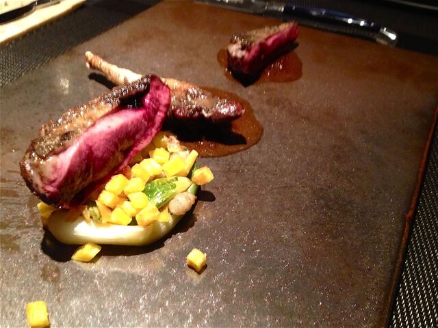 お魚は「自家製塩こうじでマリネしたマナガツオ、浅利とつぶ貝のナージュソース」。昨今、流行りの「塩こうじ」だが、さすがに此方のシェフの手にかかるとその味わいは限りなく上品で艶やかなテイストとなる。そのマジックにかけられたマナガツオは限りなく繊細で奥の深い味わい。浅利とつぶ貝のソースもエレガントな印象。。。が、ちょっと個性的な感じの「Comtes Lafon Monthelie Les Duresses 2002 PREMIER CRU」と共にいただくにはちょっと。。。せっかくのマナガツオの繊細さがどこかに飛んでいってしまったような。。。(滝汗)。。。