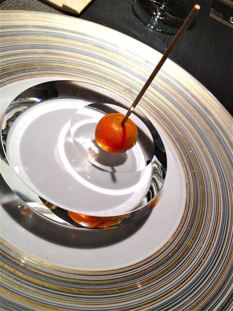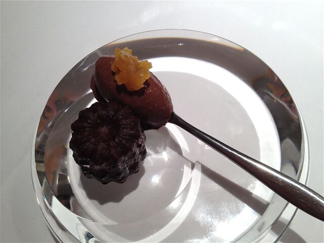「まるでデザート!」のようにも見える次のお料理の正体はフォアグラ(!)。正確には「鹿児島産タケノコとフォアグラのカネロニ仕立て」。柔らかいタケノコにトッピングされているのが、大好物のフォアグラちゃんだ。一粒一粒をしみじみと味わいながらいただく。この一瞬が永遠に続けばよいのに。。。とさえ思えてしまう(笑)。
