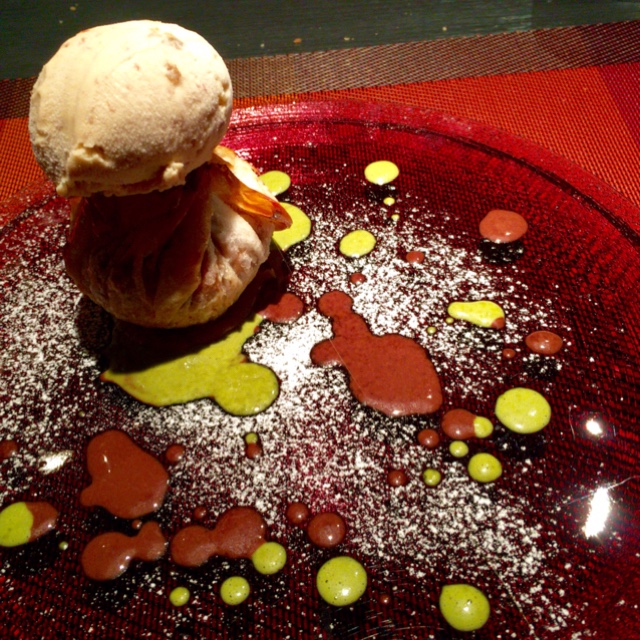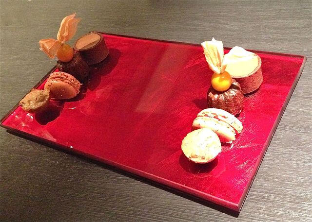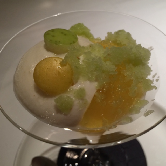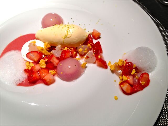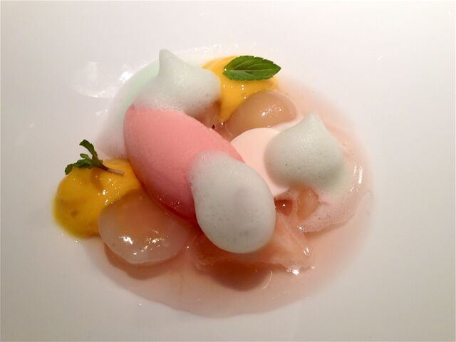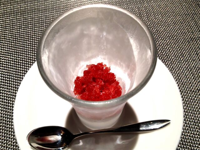 デザートは、「いちごの水まんじゅうとライチのギモーブ、生姜とレモンのアイス、パッション フルーツのクリスピー添え」。なんて乙女チックでかわいらしいデザートなのだろう!まーるい水まんじゅうはもちろん、色とりどりのフルーツが何ともいえないほどキュート!!生姜とレモンのアイスクリームも限りなく爽やかな食感。。。