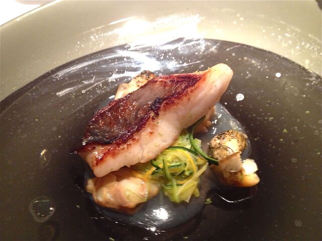 カサゴの直火焼き、ドライベルモットとサフランのソース