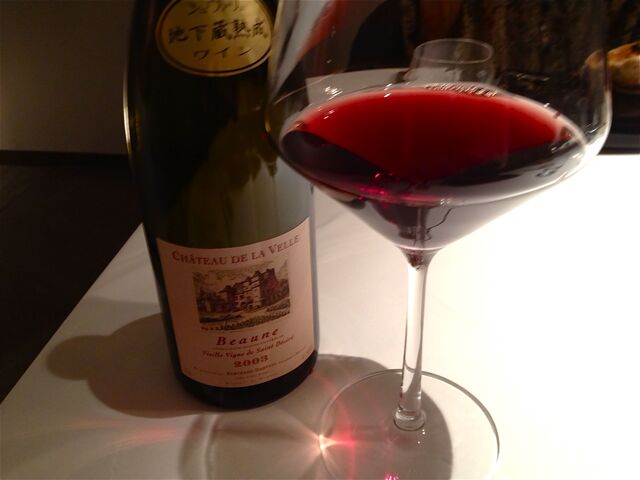 「Beaune (Vielles Vignes de Saint Desine) 2003 Chateau De La Velle」はエリゼ宮の公式晩餐会御用達ワイナリーの樹齢50年以上の古木から作られるワインとのこと。その根は地下10メートルにも及ぶのだそうだ(驚)。さらにそれに「地下蔵熟成」というラベルが貼られている。そのお味はかなり濃厚で柔らかではあるのだけれど、ジンワリと染みてくる。。。