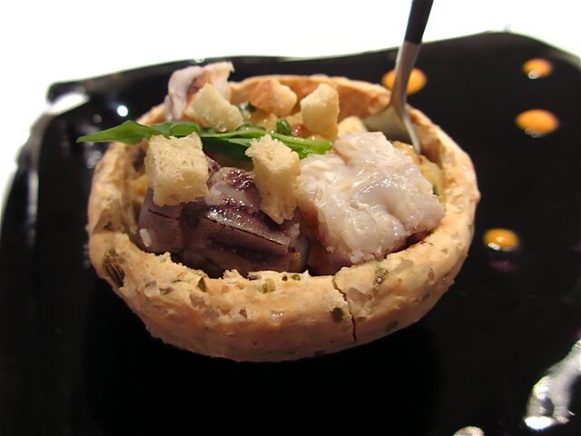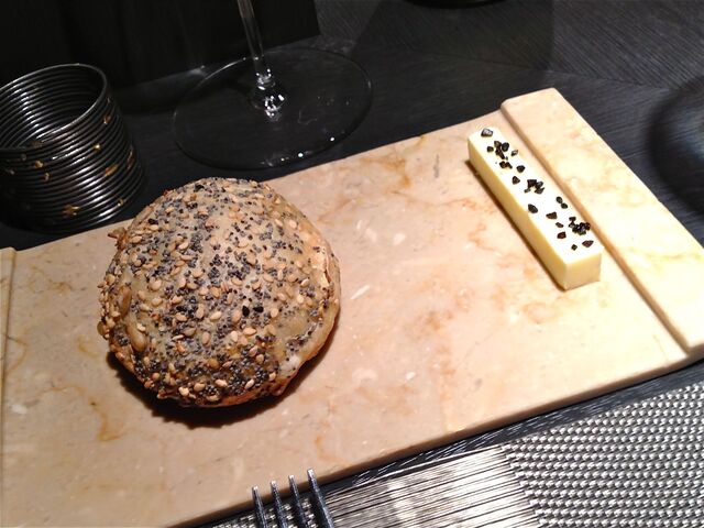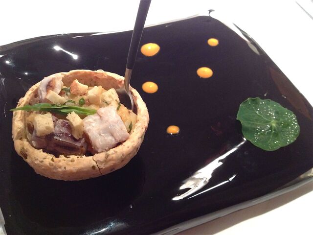 一品目の前菜はユニーク。「ナスのタルタルとドライトマト、ジャガイモと白バルサミコで味つけしたシャコとタコ」がジャガイモを岩塩とハーブで包んで焼き上げた器の中に入っている。スプーンでマゼマゼしていただくのだけれど、シャコとタコが入っているからか、オリエンタル調のような不思議な味わい。器は食べられないのだけれど、ハーブが練り込んであってかなり興味をそそられた(笑)。