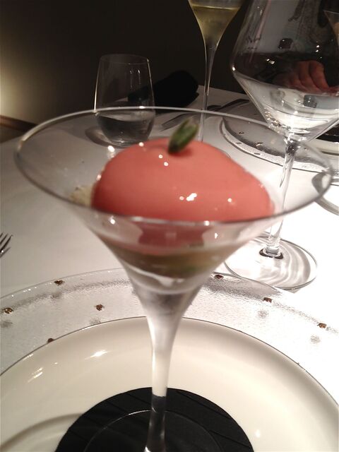 ニコニコしながら2本の「Gevrey Chambertin」を記念撮影し、5種類のベリーのグラニテでお口直し。
