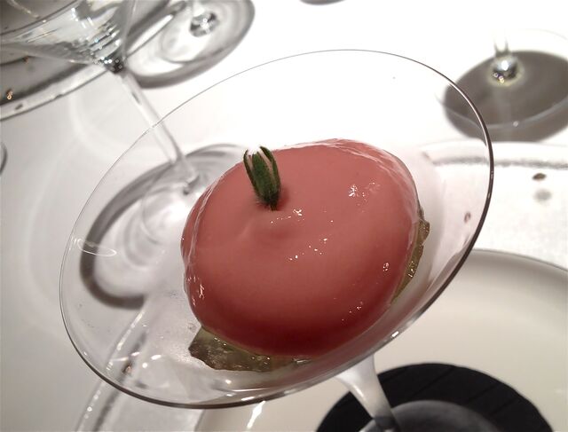 アミューズは「ウォーターメロン(スイカ)のエスプーマと鮎のリエット」。はかなげなピンク色をしたスイカのエスプーマの下に隠れているのは、ほろ苦い鮎のリエット。スイカのほんのりと柔らかな甘みと鮎のほろ苦さが絶妙のコンビネーションを醸し出す。「鮎と合わせると、スイカはこんな味になるんだー!」と、スイカ大好き人間の私はおいしくて思わず言葉を失ってしまったのだけれど、それほどでもない方にとっては好みがわかれる味か。。。日本酒が好きな人ならたぶん嵌まるのではないかと(爆)。。。