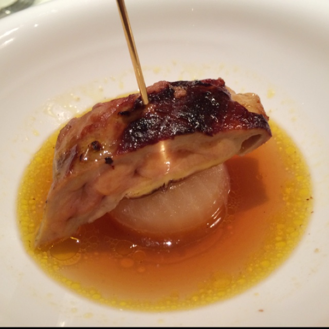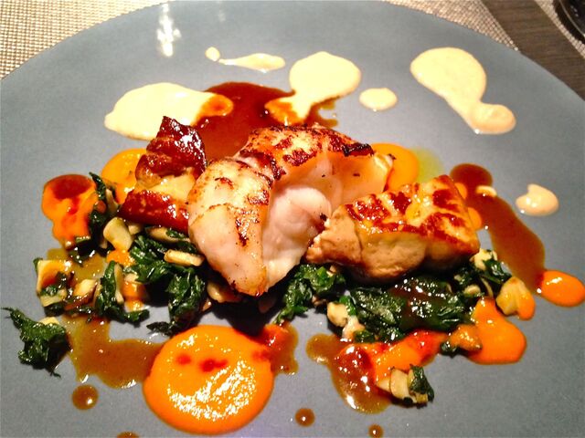 【13年12月】鮟鱇の直火焼きとフォアグラロティ、シャンピニョンとほうれん草、赤ピーマンのクーリ
