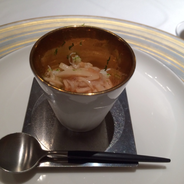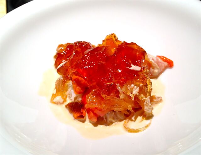 【13年12月】フカヒレのコンソメジュレ、ズワイガニと赤貝、甲殻類のソース