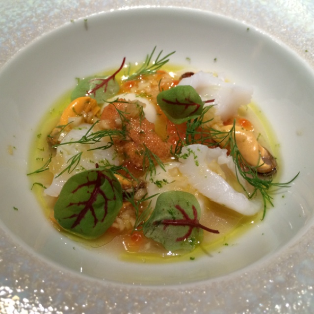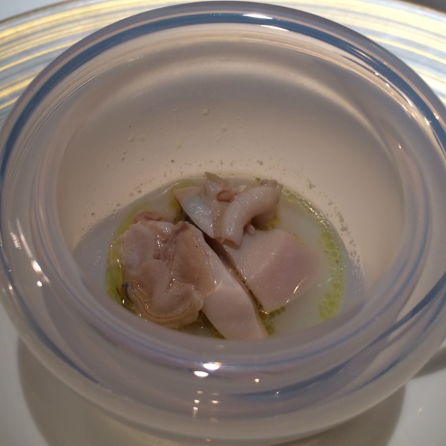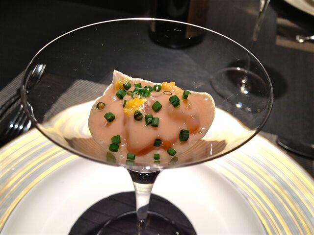 前菜一皿目は、軽く火入れした(ミキュイ)赤穂カキとはまぐり、ホッキ貝は、ラングスティーヌのクリームとベルガモットのエスプーマの海に沈み、さらにその下にはホタテのブイヨンで作った海苔ジュレが!!「グラスの底の方からすくっておめしあがりください!」ということで、一気にゴー。ラングスティーヌとホタテと海苔とその他の食材が口の中に「海」を運んでくるイメージ。これは機会があれば、もう一度食べてみたいお料理の一つだ。