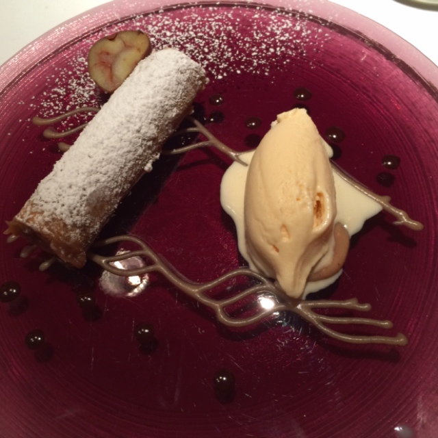 ラベンダーでマリネしたオレンジとパイナップルのブリュレ、キルシュのアイス
