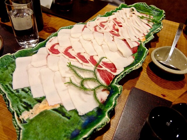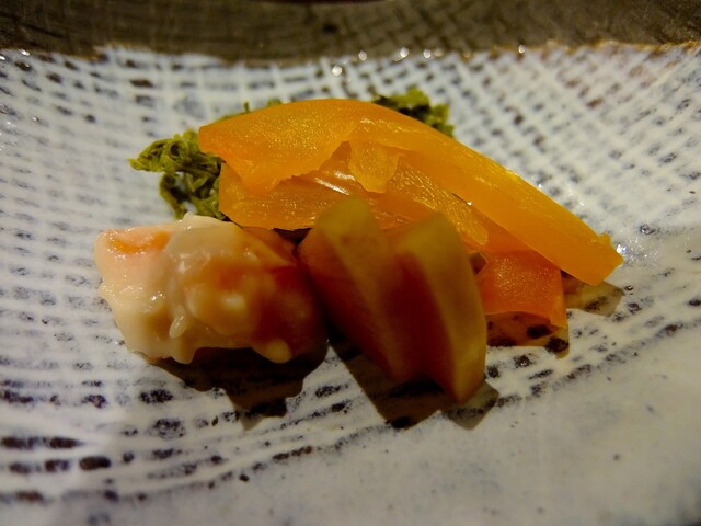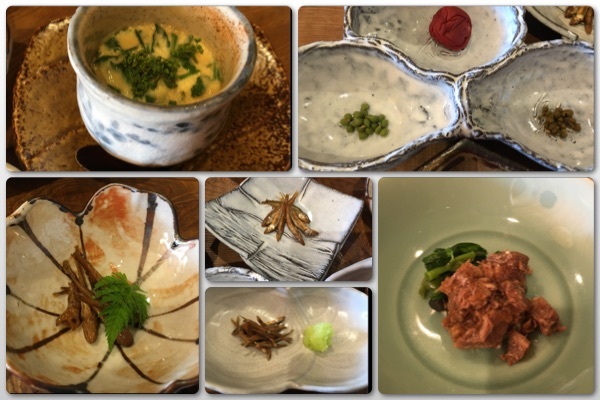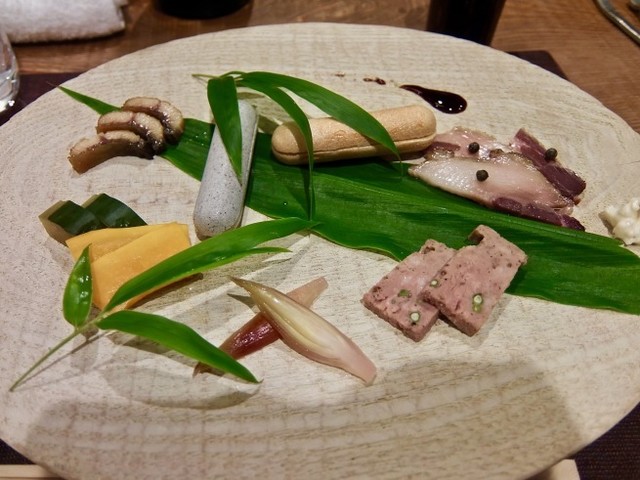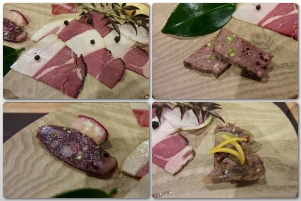 イノシシのハム、もろこ、梅酢菊蕪、鹿肉胡麻和え、ポンカンとイノシシのテリーヌ、