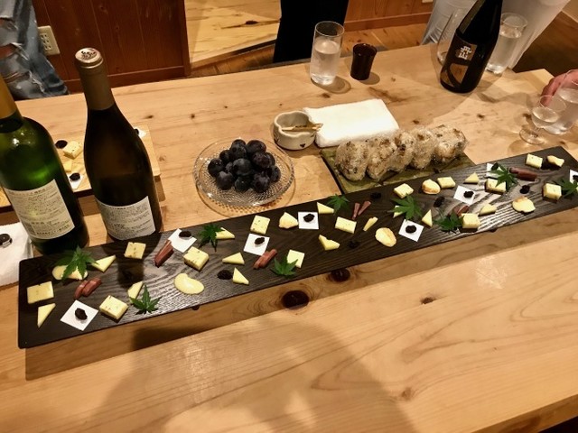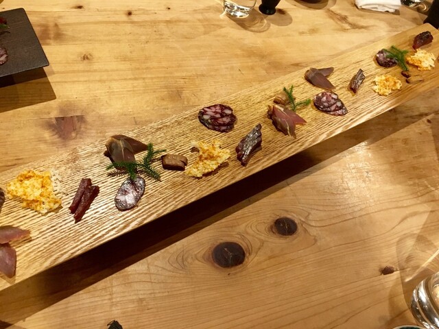 卓上に美しく並んでいるのは、鴨の燻製、くまサラミ、チーズ、さばの燻製、