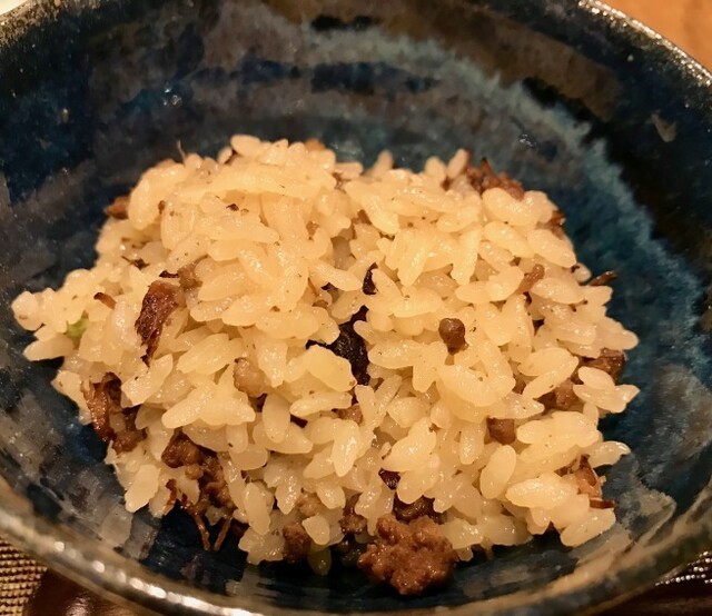 熊さんのお肉2種類を甘辛く煮付けて山椒の実と炊き上げた「熊ご飯」♪