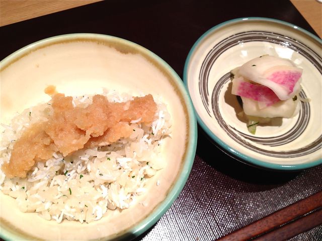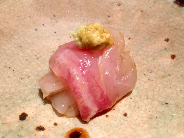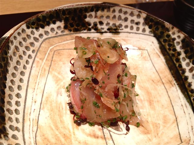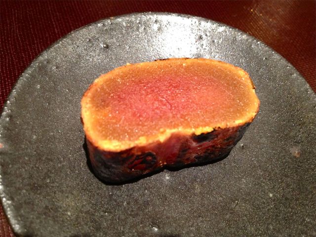 そして「二日間熟成したマナガツオ」の登場となる。マナガツオの上にトッピングされている岩のりがちょっとピリ辛風味。しっとりと濃厚さを増したマナガツオのアクセント代わりとなっておいしい。
