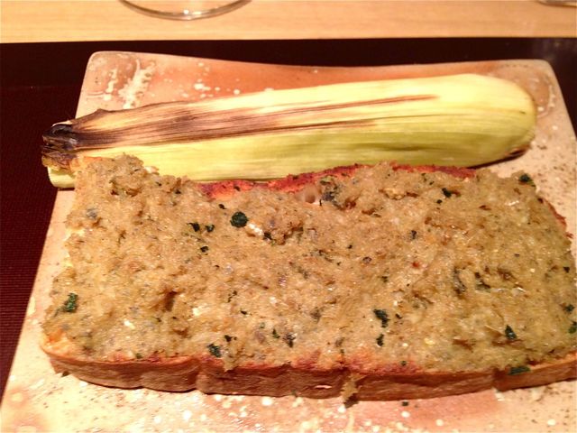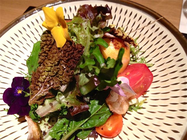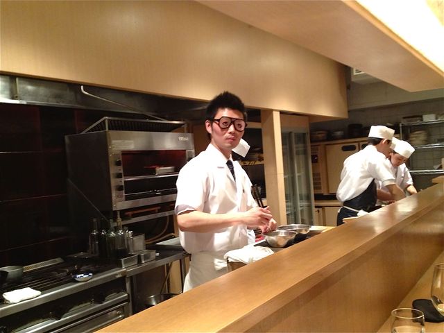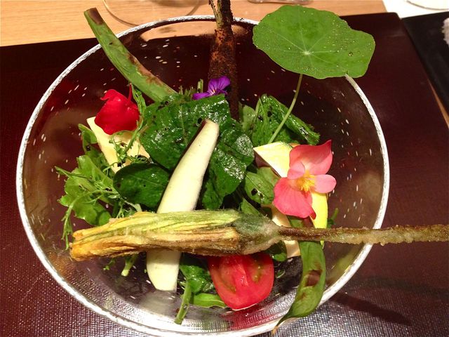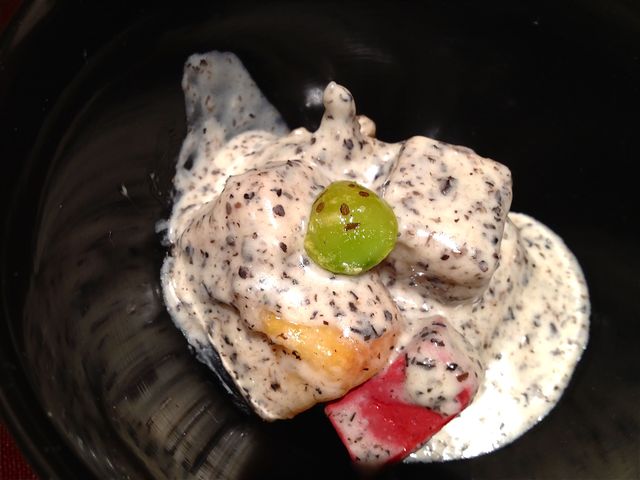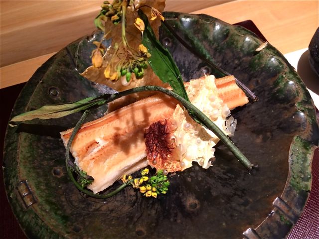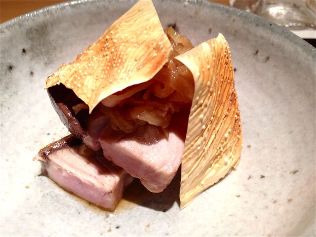 一度柔らかく煮たものを焼き上げたという「煮穴子」はあっさりとして上品な味わい。菜の花と湯葉のパリパリ感との組み合わせもユニークで面白い。写真ではわかりにくいのだけれど、湯葉の後ろに煮穴子の煮汁と鱈を合わせたペーストが添えられている。さらに黒トリュフを合わせたとのことで、その香りの芳ばしいことっ!!