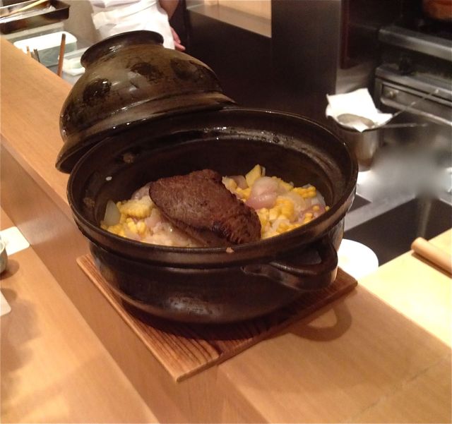 とても柔らかくて甘い「蕪とアンコウの焚き合わせ」の後に登場するのが、「黒毛和牛のサーロインとタケノコご飯」!!そのビジュアルの素晴らしさもさることながら、お肉の脂がご飯にからんで、しかもタケノコのしゃりしゃり感が際立ってとても美味しい。思わずお代わりしてしまった(汗)。。。