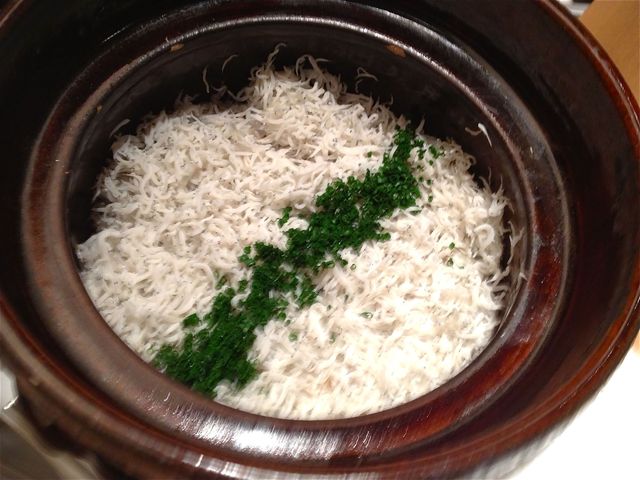 〆のご飯は春の香り満載の「桜海老の炊きこみご飯」。「これでもかー!」というほどに桜海老がてんこ盛り状態(笑)。すでにお腹はいっぱいだったのだけれど、たっぷりといただく私たちなのだった(呆)。