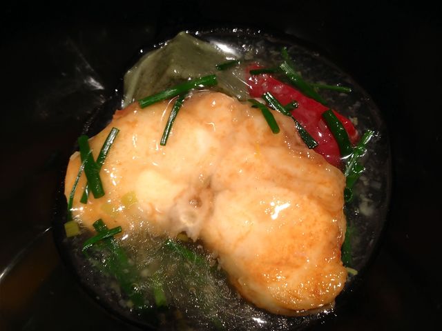 横に添えられているアスパラガスのようなお野菜が「黒キャベツ」だ。あまり見かけない形状だが、お花の部分なのだろうか。ほろ苦いような甘みが、やはり「春」を感じさせる一品。海老芋もおいしい!