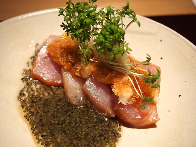 やはり熟成させた「ぶり」は辛味大根とタップリのトビウオの卵と共に。トッピングのグリーンはクレソンの赤ちゃんとのこと。