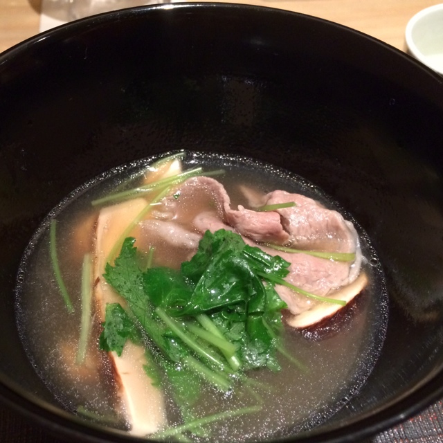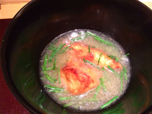 「スペシャリテのサラダ」をいただき、続いては「田酒の大吟醸などの酒かすを使った鱈と白子のお椀」。大きな椎茸がアクセントとなった此方はほっこりと温まるテイスト。トロトロにとろける感じの白子がまたグー!!」