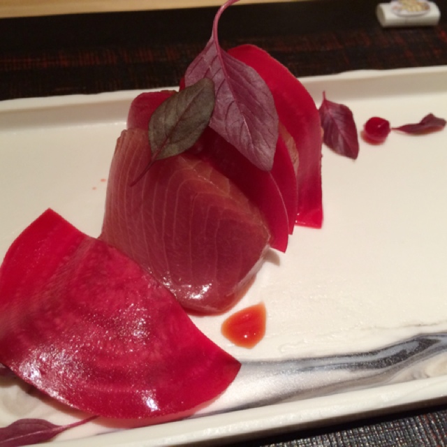 3日間熟成させた「メジマグロ」は紫外線予防に良いという「ビーツ」と辛子を効かせた「ぬた」のソースでいただく。添えられているのはウドと下仁田葱。2色のソースは「春」を感じさせる可愛らしい彩りだが、ビーツのピンク色にはちょっと抵抗がある。(此方には何の責任もないのだけれど、ずっと以前にミラノで食した「ドピンクのパスタ」(日記欄のどこかで写真をアップしていたと記憶!)をどうしても思い出してしまう(爆)。ごめんなさい!!)。。。