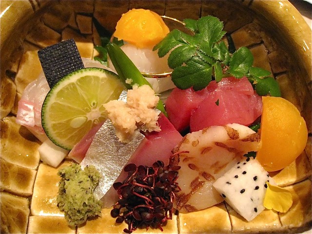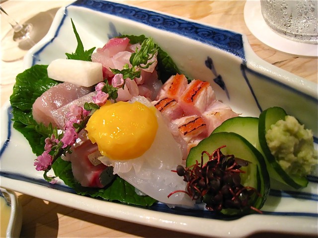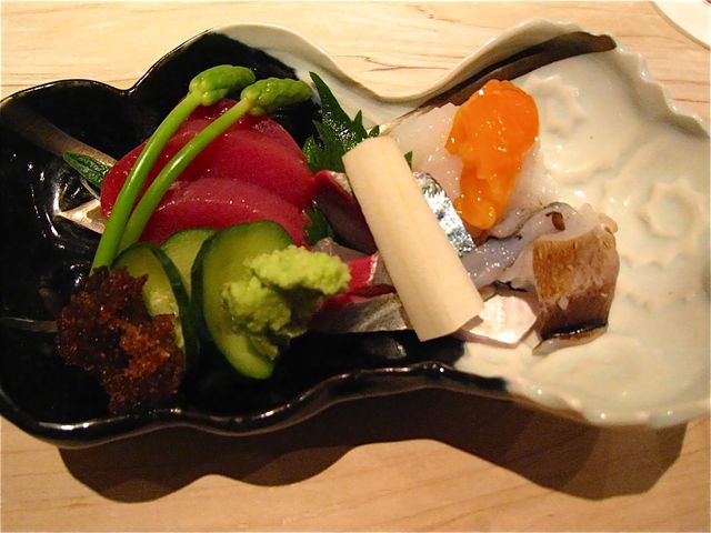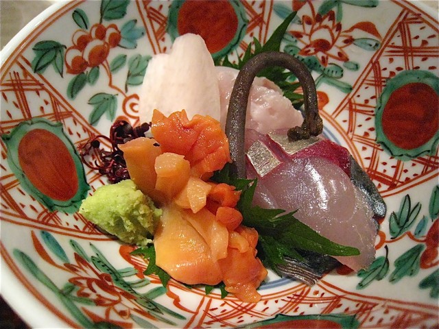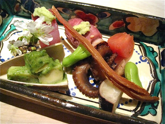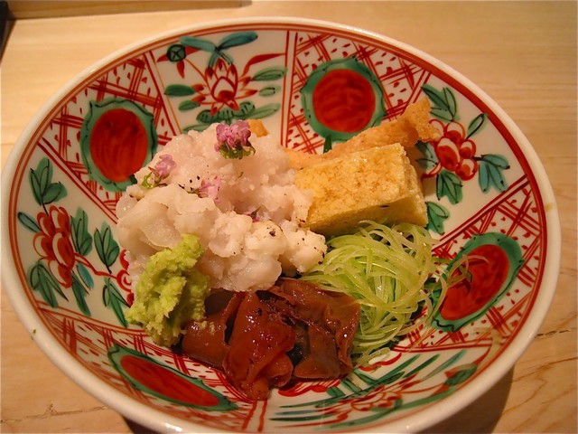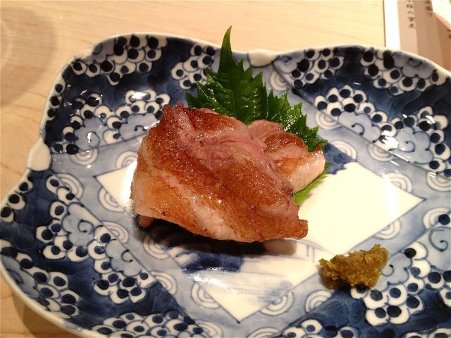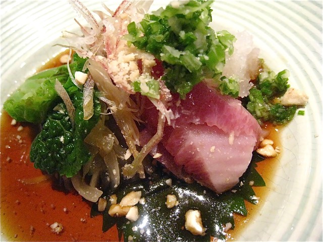 本日のお造りは「大間の鮪」と「明石の紅葉鯛」。「仲買を通さないで直接買い付けた大間の鮪!」というお墨付きだったが、誠に失礼ながら、少し前に自宅でいただいた「大間の鮪」の方がおいしいように感じた(汗)。もちろん好みもあると思うのだけれど。。。