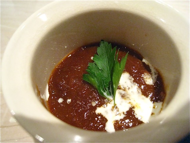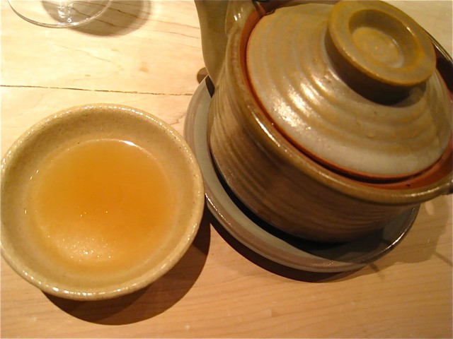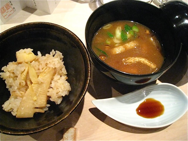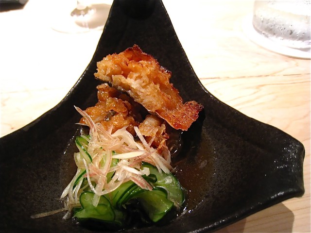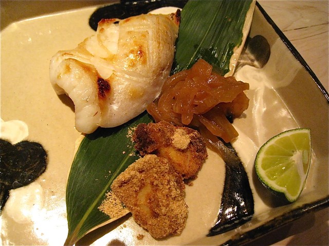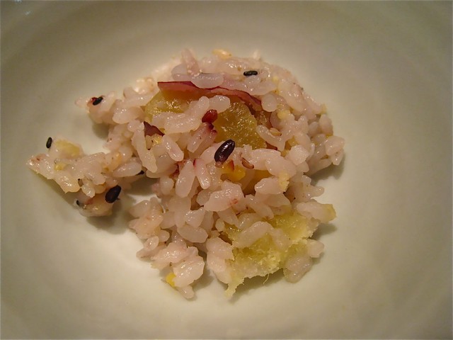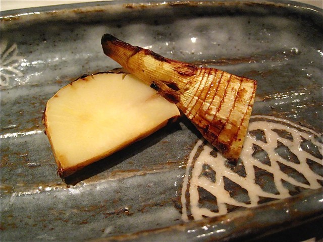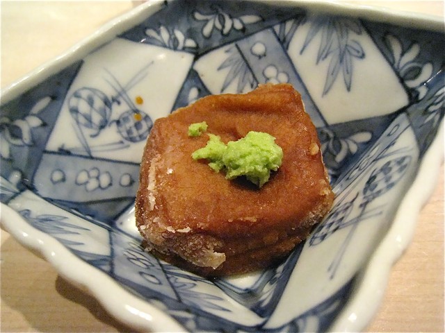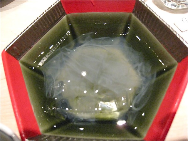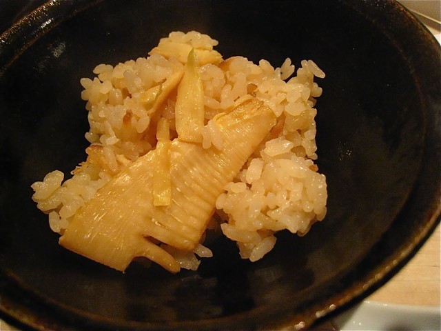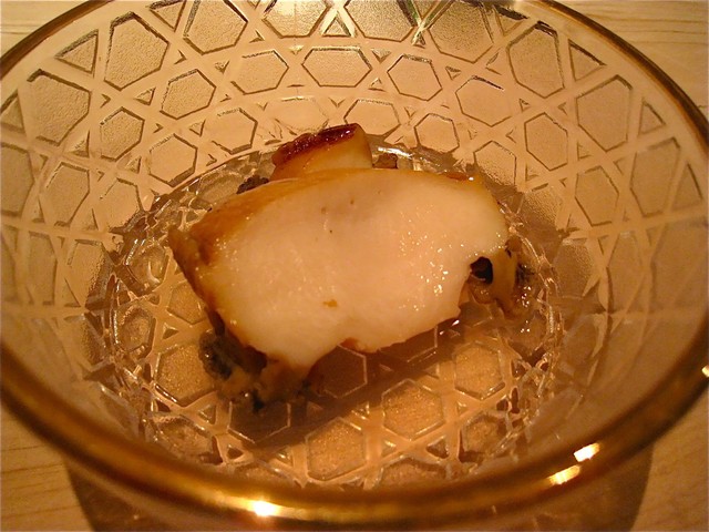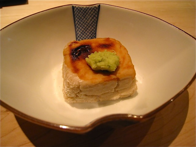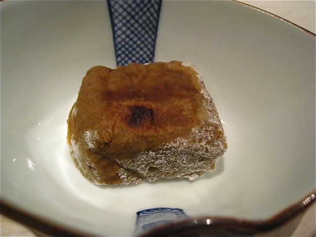 「ローストした豚肉」を柚子味噌でいただいた後は、いつもの「焼き胡麻豆腐」がサーブされる。独特の味わいでおいしいのだけれど、どなたかも書かれていたようにお醤油をかけなかったらどのようなお味になるのだろう?ちょっとトライしてみたいような気もする(笑)。と言いつつ、そろそろ「蕗の薹バージョン」の「焼き胡麻豆腐」が登場しているはずだ。あれは密かな好物なのでちょっと舌なめずり(笑)。