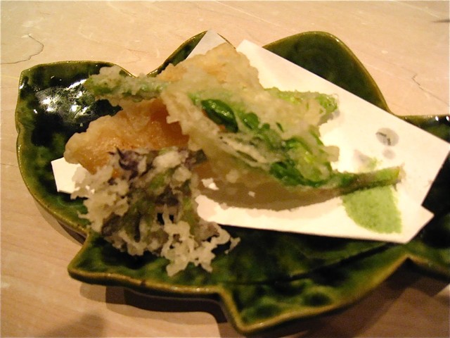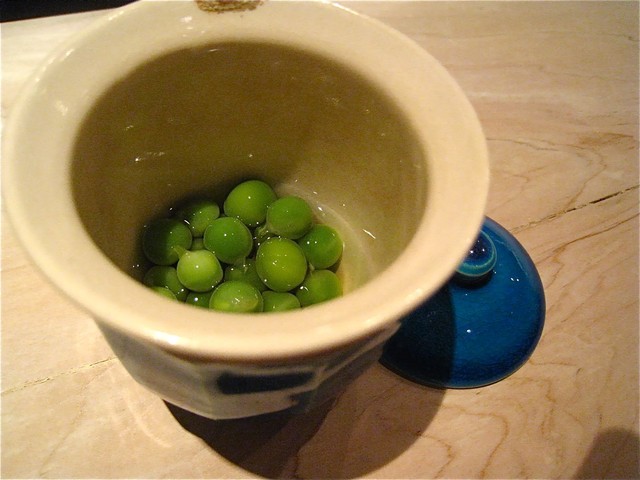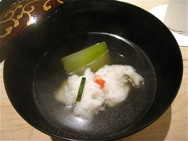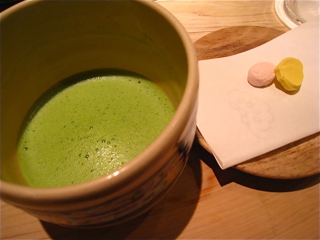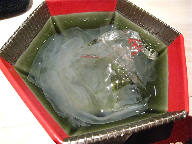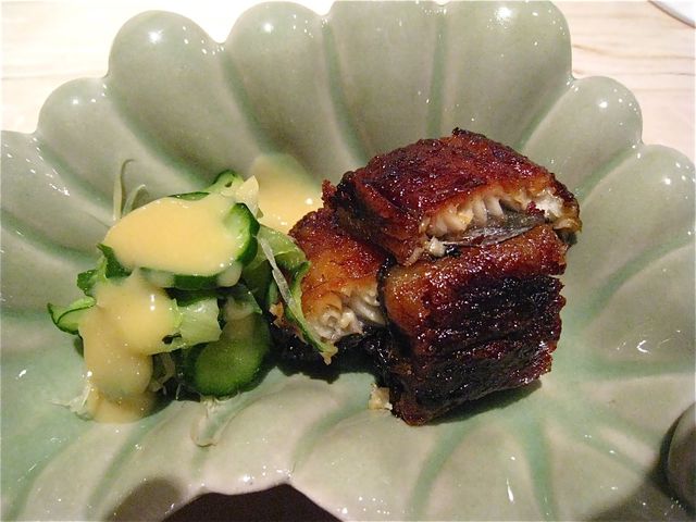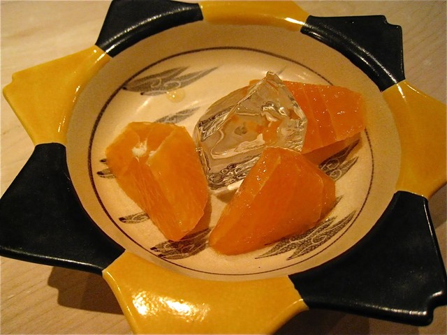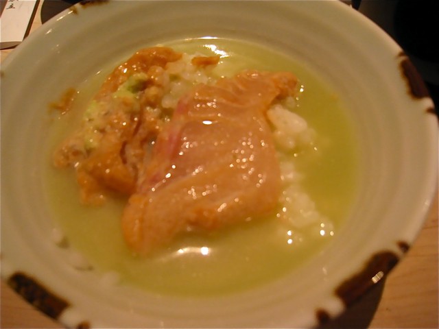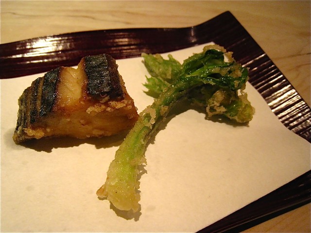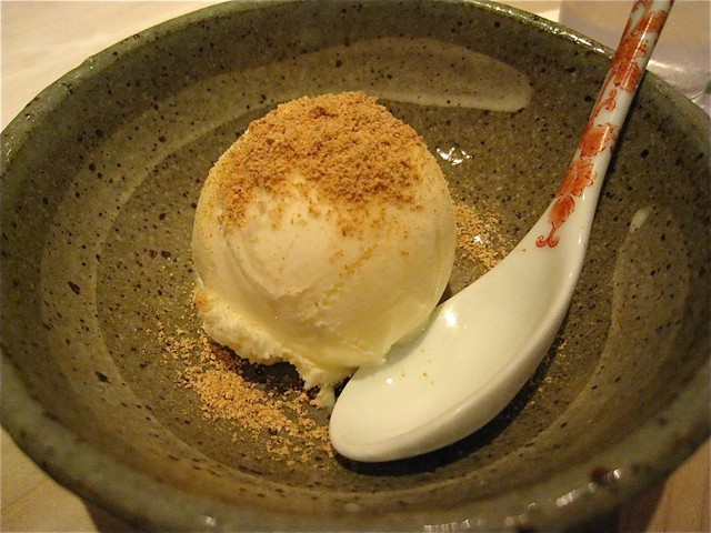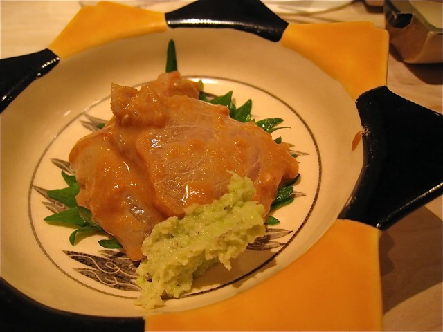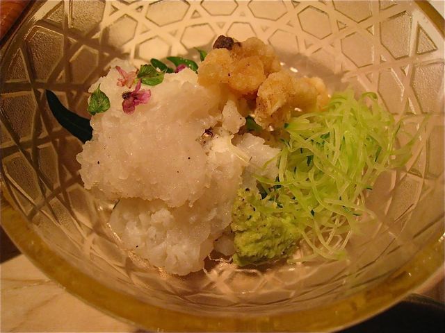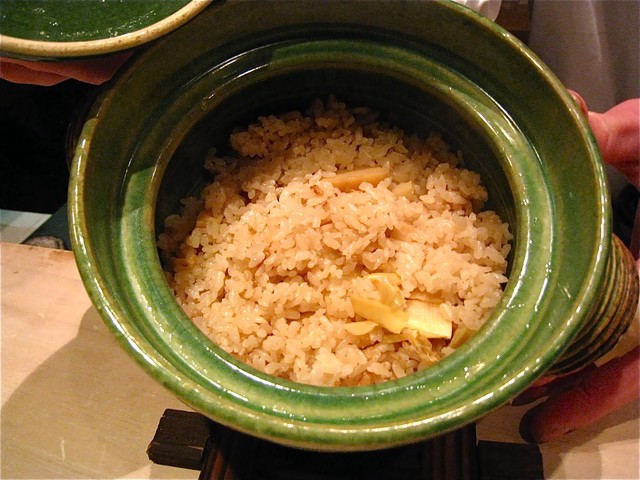 「ローストした豚肉」を柚子味噌でいただいた後は、いつもの「焼き胡麻豆腐」がサーブされる。独特の味わいでおいしいのだけれど、どなたかも書かれていたようにお醤油をかけなかったらどのようなお味になるのだろう?ちょっとトライしてみたいような気もする(笑)。と言いつつ、そろそろ「蕗の薹バージョン」の「焼き胡麻豆腐」が登場しているはずだ。あれは密かな好物なのでちょっと舌なめずり(笑)。