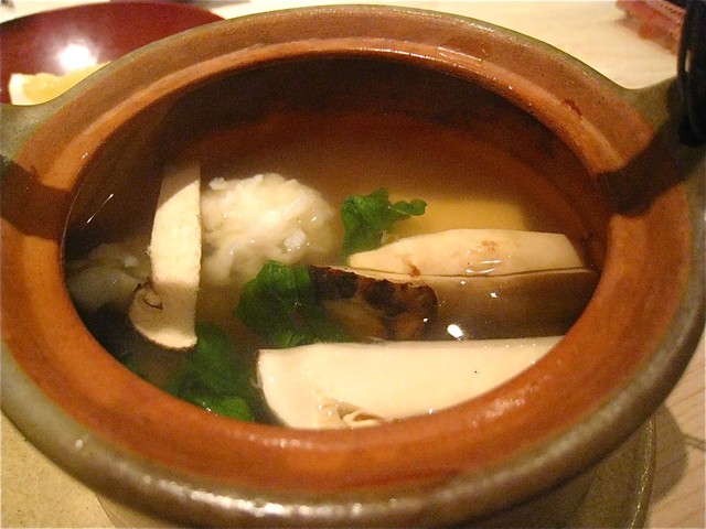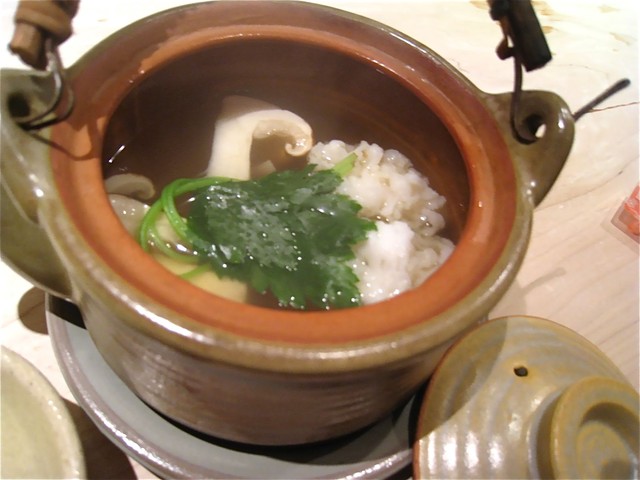 そしておよそ1年ぶりに此方でいただく「土瓶蒸し」の登場となる。昨年の「土瓶蒸し」に比べると、中に入っている「松茸」の大きさに思わずのけぞりそうになる(爆)。「そろそろ松茸の季節もおしまい!」ということでサービスしてくれたのだと思うのだけれど、ちょっと入りすぎ(汗)。贅沢をいうようだけれど、私は昨年バージョンの方が好きかも(笑)。その分、「炭火焼き」に回して欲しかった(爆)。が、松茸と鱧のエキスをたっぷりと吸ったお出汁はやはりおいしい。過ぎゆく秋を満喫してしまった。