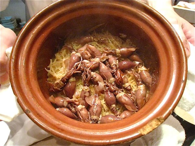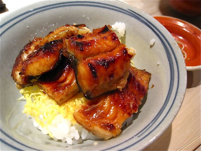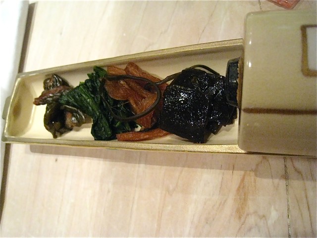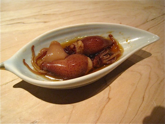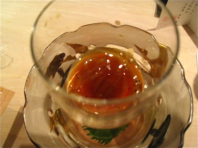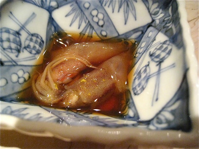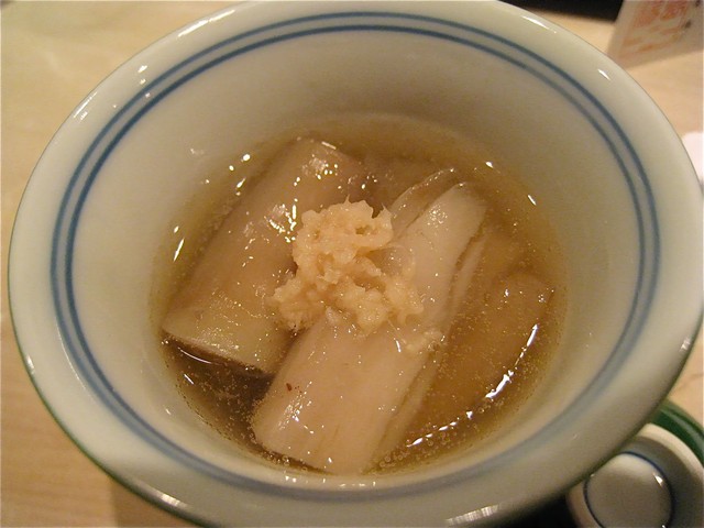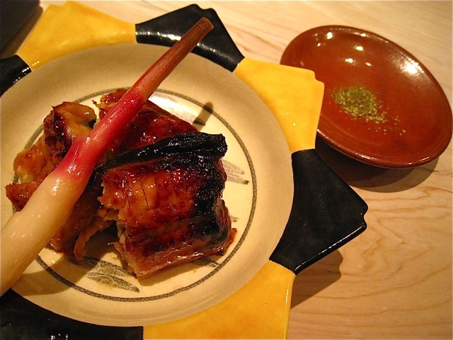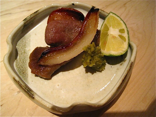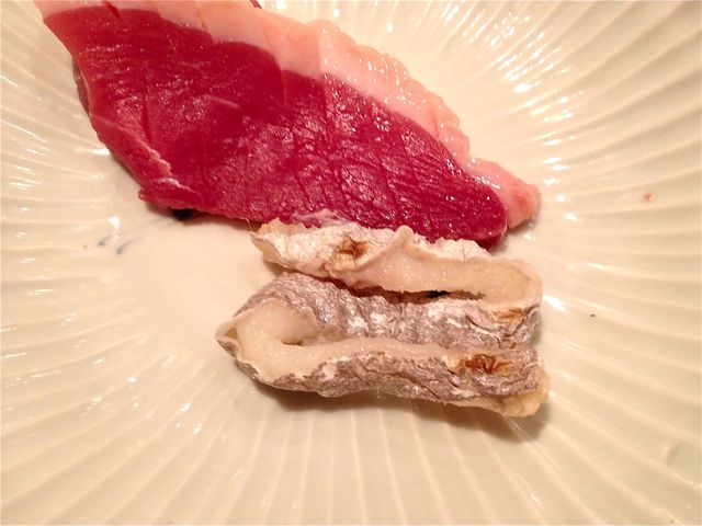 まだ少しお酒「独楽蔵 特別純米 然」が残っていたので「鴨の塩漬け」をいただく。まるでハモンセラーノをいただいているようなしっとりとしたまろやかな味わい。。。あまりのおいしさに歓声をあげながら食べていたら「すなずり」(!)まで登場。軽く炙っているのだけれど、これがいわゆる「砂肝」とは異なる珍味系。こりこりっとしていながら、まったり系のかみ応えのある食感。言葉が足らなくて申し訳ないのだけれど、かなり不思議なテイストだった(笑)。