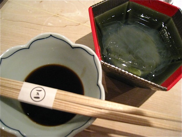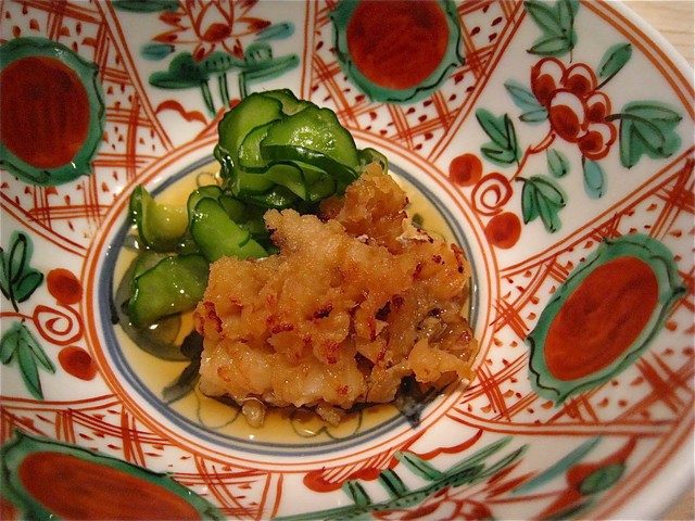 「鱧の叩き」の鱧は韓国産とのこと。あっさりした味わいの「夏の鱧」に対して、「秋の鱧」はしっかりとした旨味とねっとりとした舌ざわりが特徴らしいという話は他店のレビューでも書いたが、韓国産のハモは国産に比較して骨や皮がやわらかく、身に脂ものっていてビタミンAも豊富なのだそうだ。たしかに夏にいただいたものよりも濃厚でこってりしているような印象。
