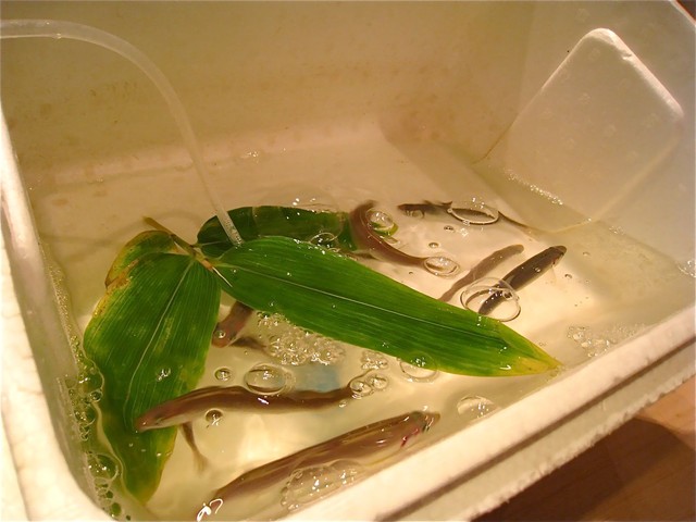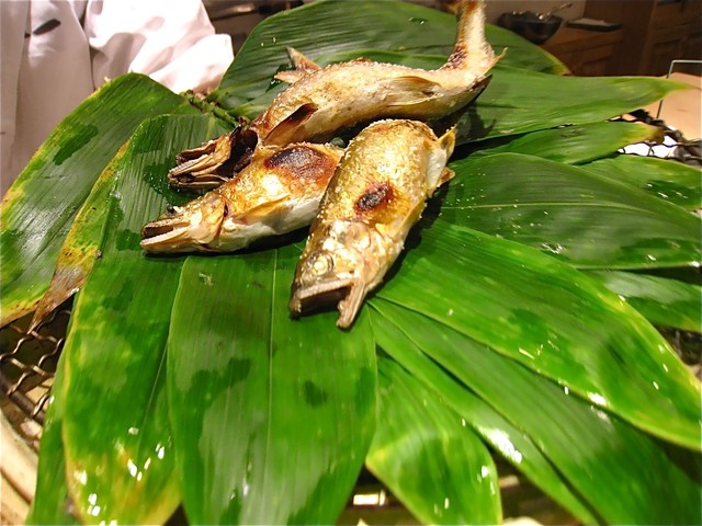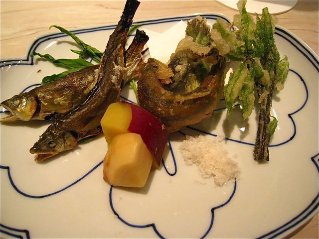 魳寿司、梅と鰹和え、いちじくの柚子味噌和え、豆乳ときなこの寄せ合え、手長海老の素揚げ、谷中生姜の甘酢漬け、白瓜のかみなり干し、とうもろこしの寄せものなどの季節感をあしらった八寸をいただいた後は、お待ちかねの「活鮎」が登場する。この日の鮎は琵琶湖周辺で獲れたものとのこと。ピチピチと元気よく飛び跳ねる鮎くんたちをご披露後はそのまま串刺しに。。。初物の「鮎」はこの季節ならではの弾けるおいしさ(!)。サイズもちょうどよい感じで頭からシッポまでガッツリと味わいながらいただける(嬉)。