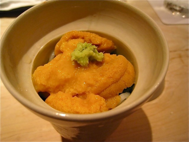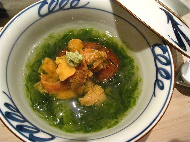 「菖蒲酒」をいただいた後の最初のサプライズが「手のせ雲丹」(!)。一人ずつ、お手々にそっと載せてくれる「雲丹」は、文字通り、とろけてしまいそうなほどの美味しさ。トロトロの甘〜い雲丹の下には少量のしゃりが!!名残惜しい感じでモゴモゴ(笑)。。。