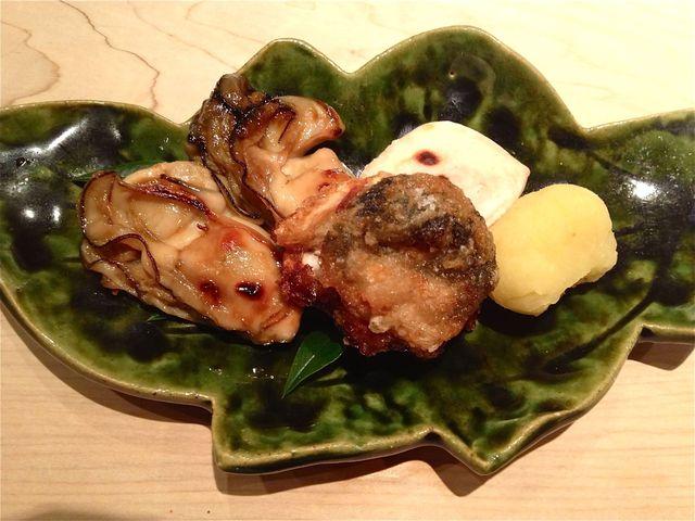 続いて「白子の塩焼」「ふぐの唐揚げ」、さらには「牡蠣のオイル焼き」が三つどもえとなったスペシャルプレートが登場(喜)。