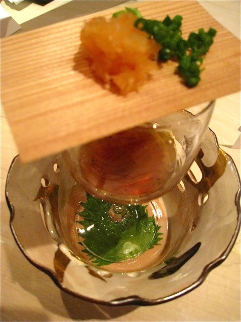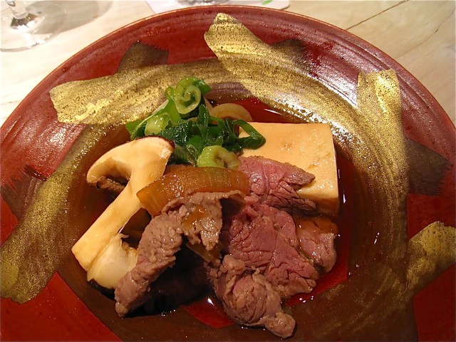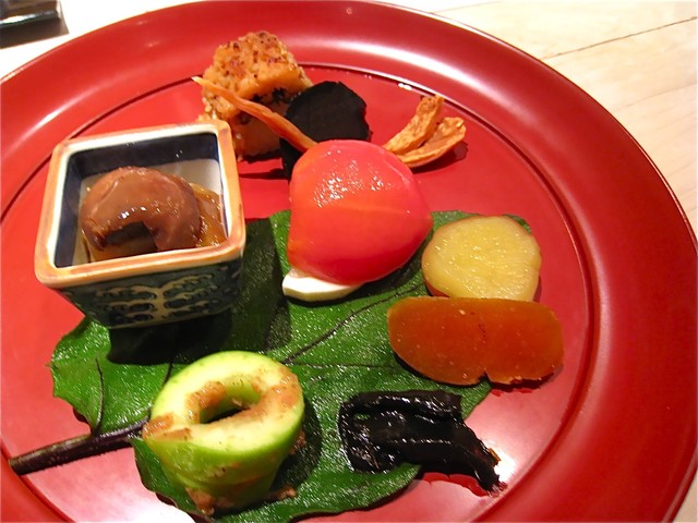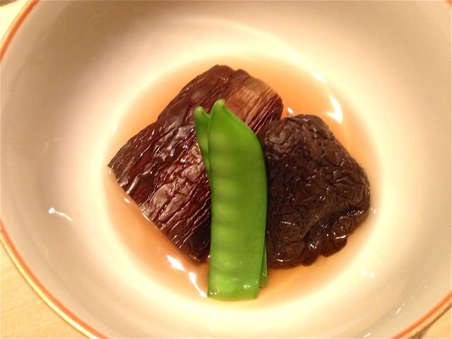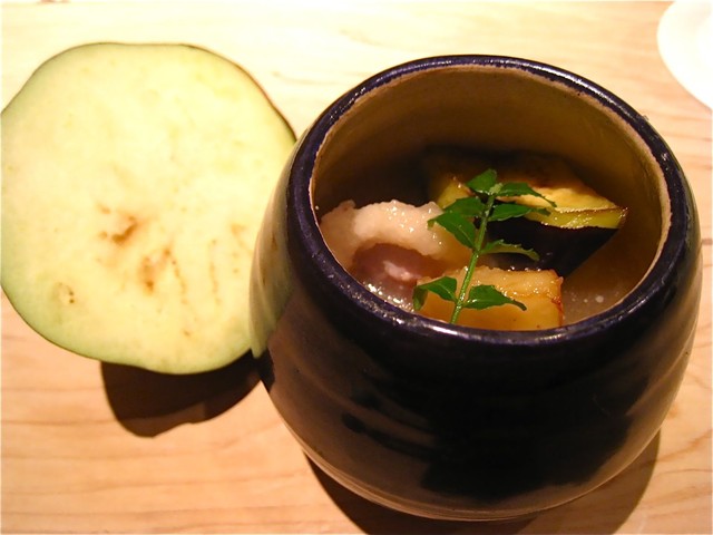 前回は蔵王鴨だったのだけれど、今回は合鴨とのこと。相変わらず賀茂茄子のヘタの部分を蓋に見立てた茄子色の器は健在だった(笑)。鴨肉のお出汁を極限まで吸い込んだ賀茂茄子はやはり美味。濃厚なお味が大根おろしでやさしく中和され、ほっこりとおいしくいただくことができる。
