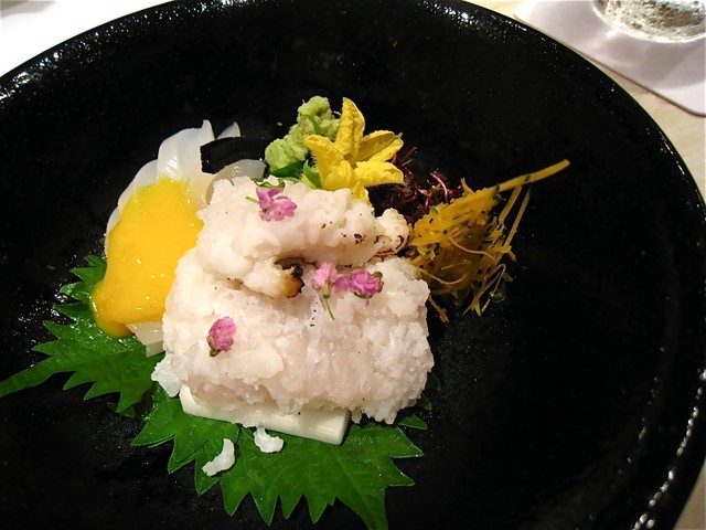 「桐花 純米吟醸無濾過生原酒」といただく「お造り」は明石の鯛と蛸。その下にはグリーンアスパラが隠れていた。さらにはこの季節ならではのお楽しみの「鱧」が!!お造りの「鱧」は初物なので「おほほ!」と味わいながらいただく。