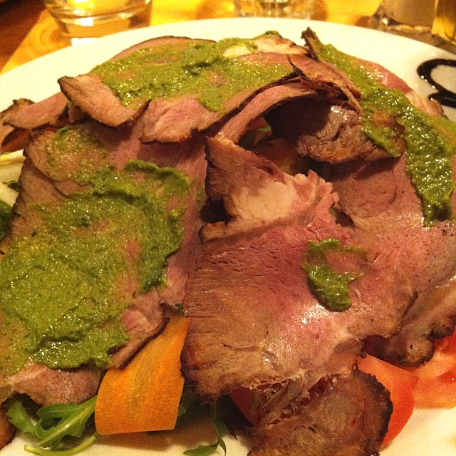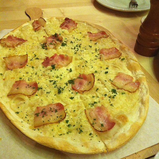 ドイツ居酒屋にてピザ上の薄餅生ハム風味
