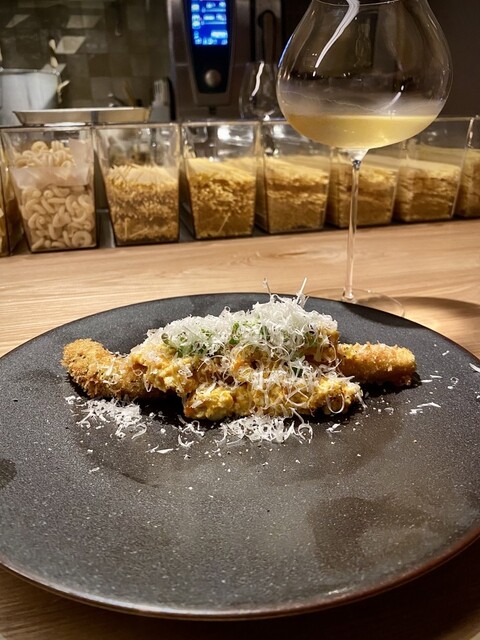カリッと揚がったアスパラに濃厚な黄身のソース、ワインがワインがすすむくん