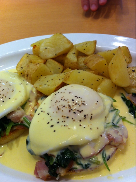 まず、エッグスベネディクトですが、とにかく軽い。厚いカナディアンベーコンと一緒に供されることが多いなかで、薄目のベーコンとほうれんそうがポーチドエッグとイングリッシュマフィンのバランスを取ります。サイドのポテトも美味いです。