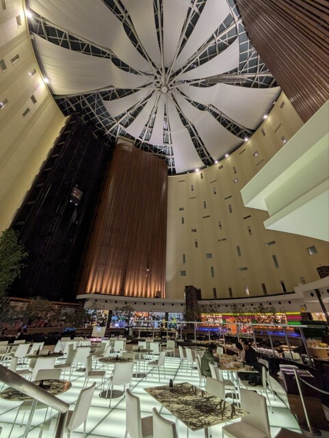 席から見える窓の外には中庭と時間帯も相まって、ナイトプールが見える。