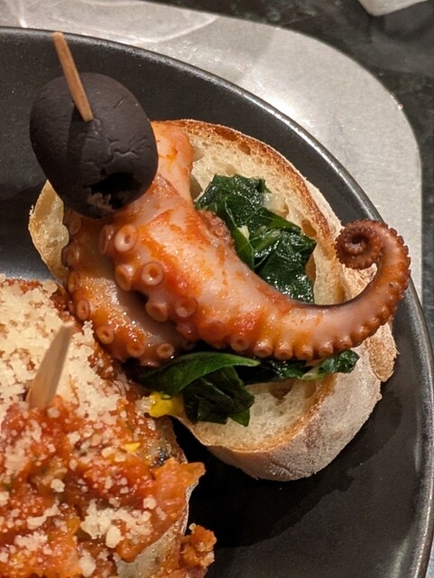 ワインをボトルで頼み、それ以外はバゲットにタコやレバーなどが乗ったものを注文