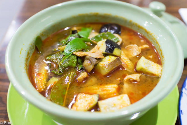 構成は、豚肉薄切り、ナス、ピーマン、ヤングコーン、フクロタケ、爆弾青プリック(ウルトラ激辛)、ガチャーイ、フレッシュなバイホーラパーやバイマックルートもたっぷりで香りも最高(これに生胡椒があれば完璧)。
