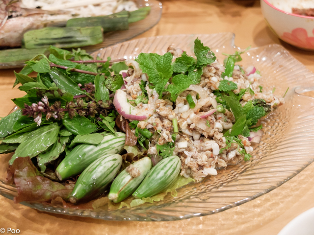 豚肉入りのパラーサップ、パラーサップとはイサーンの魂と言われる発酵魚調味料パラーラーを細かく砕いたものに各種スパイスやハーブなどをクロックしたもの