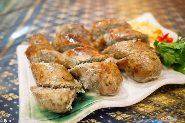 自家製の東北タイ式ソーセージ、大きくてジューシーで柔らか、ニンニクがばっちり効いている、ウンセン(春雨)入り、細かく刻んだハーブ(バイマクルートかな)も香り付けにイン、味付けも言うことなしっ!(☆5)