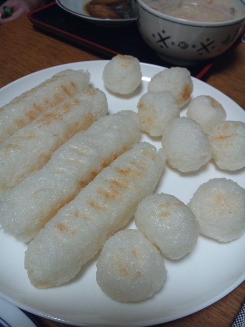 ご飯を炊き、それを少し潰し、片栗粉を少し入れて繋ぎにする。杉の棒が無いので割り箸にご飯をちくわ状に付けてホットプレートで焼く。