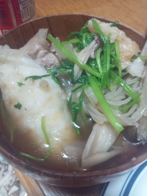 粉末の鶏ガラ出汁を代用しスープ作り・・・本だし。砂糖微量、お酒、塩、醤油で味を整えて鶏肉を投入・・・これでそれなりのスープの出来上がりです。