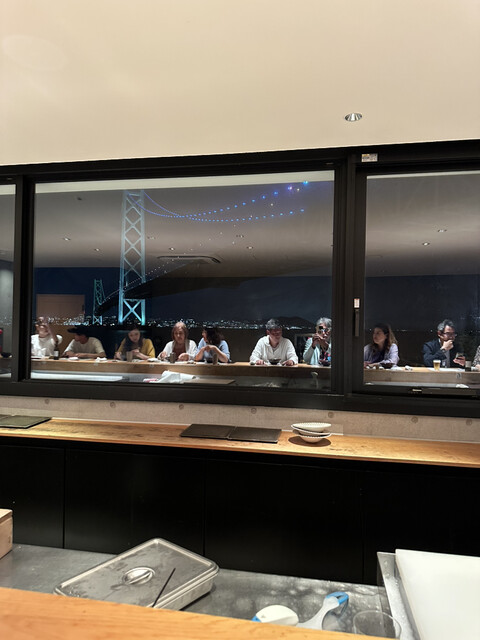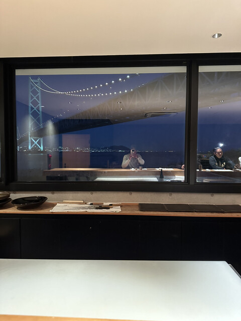 入店すると長いカウンターの4人掛けの席が二席の贅沢な作りで、カウンター越しに大きな窓があり、時間によって様変わりする明石海峡大橋を眺める事が出来ます。