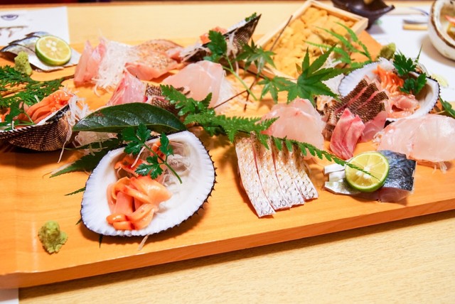 二皿目は、白身魚、ウニやアワビ、貝にサーモンとイクラの組み合わせ!