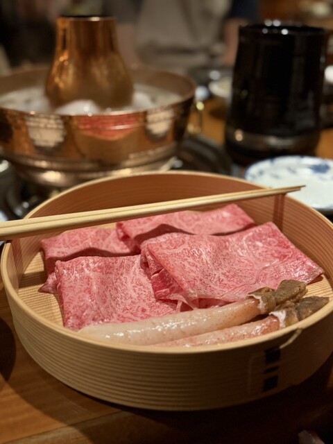 お通しから丁寧な仕事ぶりが伝わり、お造りは鮮度・切り付けともに申し分なし。盛り込み料理は銀だら西京焼をはじめとする四品で、どれも味付けが上品で、素材の良さが引き立っていました。メインの神戸牛とかにの合盛りしゃぶしゃぶは圧巻。神戸牛はさっと火を入れるだけでとろける旨さ、かには出汁との相性が良く、贅沢な味わいを楽しめます。