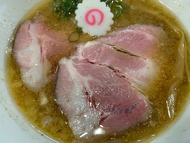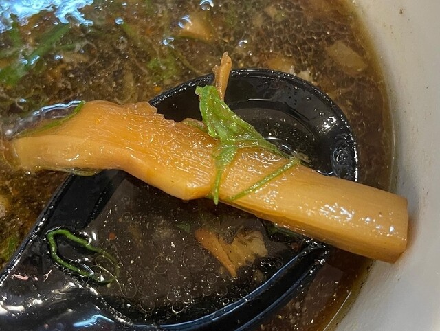 昆布に包まれて追いかけてくる魚介の風味と鶏油のまろやかな甘みが溶け込んだ出汁を、