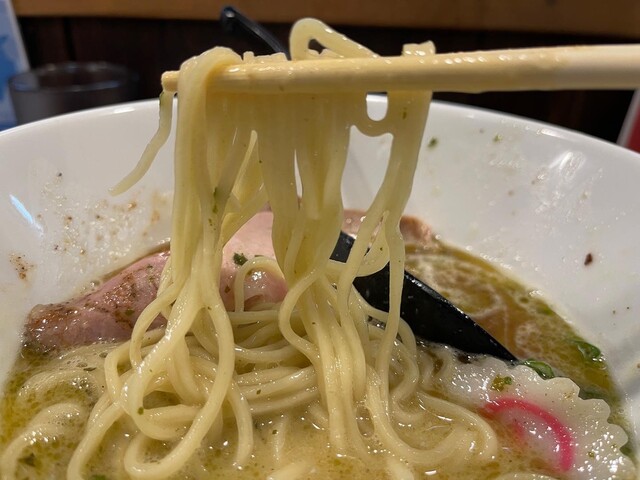 抜群の絡みと啜り心地に加えてモチッとした食感から自然と溶けていく馴染みの良さでスープを運んで、