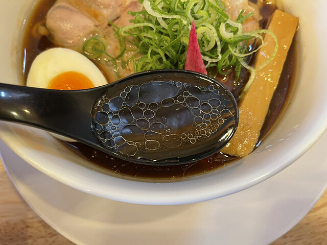 醤油と魚介の香ばしい香りが湯気に乗って上がるスープは